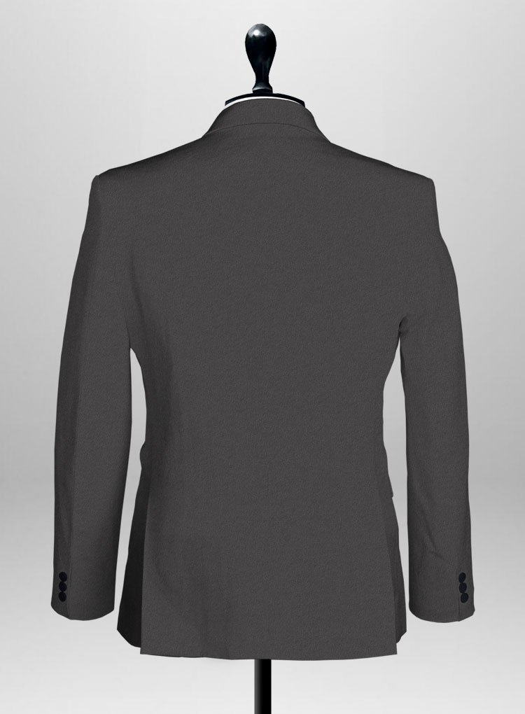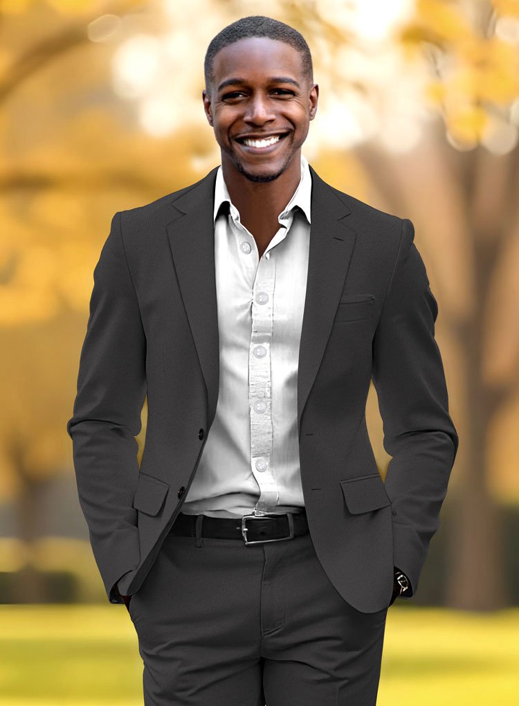 Its deep black hue exudes a timeless appeal while offering an adaptable foundation that complements various shirt and tie combinations to cater to formal or semi-formal occasions. The suit’s meticulously tailored lines accentuate a sharp silhouette, enhancing the wearer’s physique with precision cut lapels and sleek, flat-front trousers.