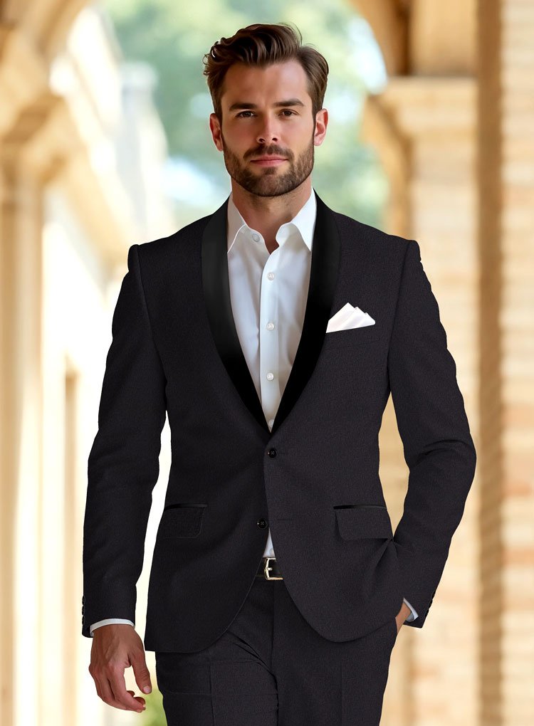 Tailored to perfection, it shapes a clean, confident silhouette that feels both sharp and comfortable. Sleek satin lapels provide a smooth contrast against the textured fabric, elevating its refined appeal. Ideal for evening receptions, formal gatherings, and stylish celebrations, this tuxedo delivers understated sophistication, making a lasting impression through detail, craftsmanship, and effortlessly polished charm.