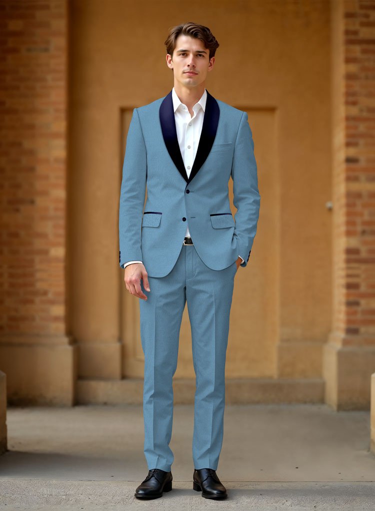 The rich blue fabric shimmers subtly under evening lights, offering a modern twist on classic formalwear. Expert tailoring sculpts a sharp silhouette, while sleek satin lapels add contrast and sophistication. Designed for gala nights, weddings, and grand celebrations, this suit balances bold color with timeless elegance, ensuring every entrance feels unforgettable and impeccably styled.